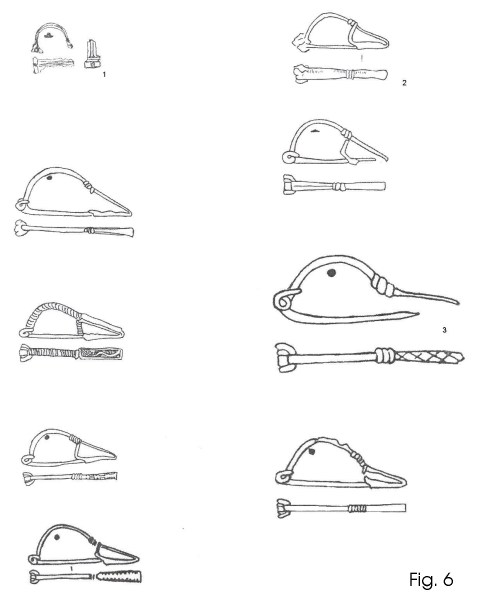 Discoveries of early Roman types of two-piece fibulae -avcissa (Fig. VI-1) and T-shaped pins (N° 35 of Abgidzrakhu)- point to the intensive utilization of the route directed towards North Caucasus [20]. 'Lebiazhiy' type phibulae characteristic of the 4th cent. are discovered in burial N° 31 of Abgidzrakhu [21] (Fig. VI-2). It can be conjectured that strongly profiled phibulae (Fig. VI-3) characteristic of North Caucasus (Alania, the 4th cent.) were penetrated into West and East Georgia via Tsebelda. Finds of pins imported from Eastern Georgia in the burial N° 6 of Apushta and their discoveries in North Caucasus must have implied functioning of the Kodori route.