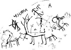 humans in mushroom-shaped hats, of archers, ibexes, stags, wolves and